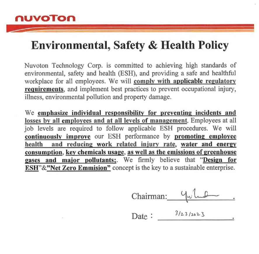 Nuvoton Technology is committed to establishing a safe, healthy, and compliant workplace environment, promoting a safety culture, implementing risk management, safeguarding employee rights and interests through effective communication, and working with stakeholders to achieve sustainable development.